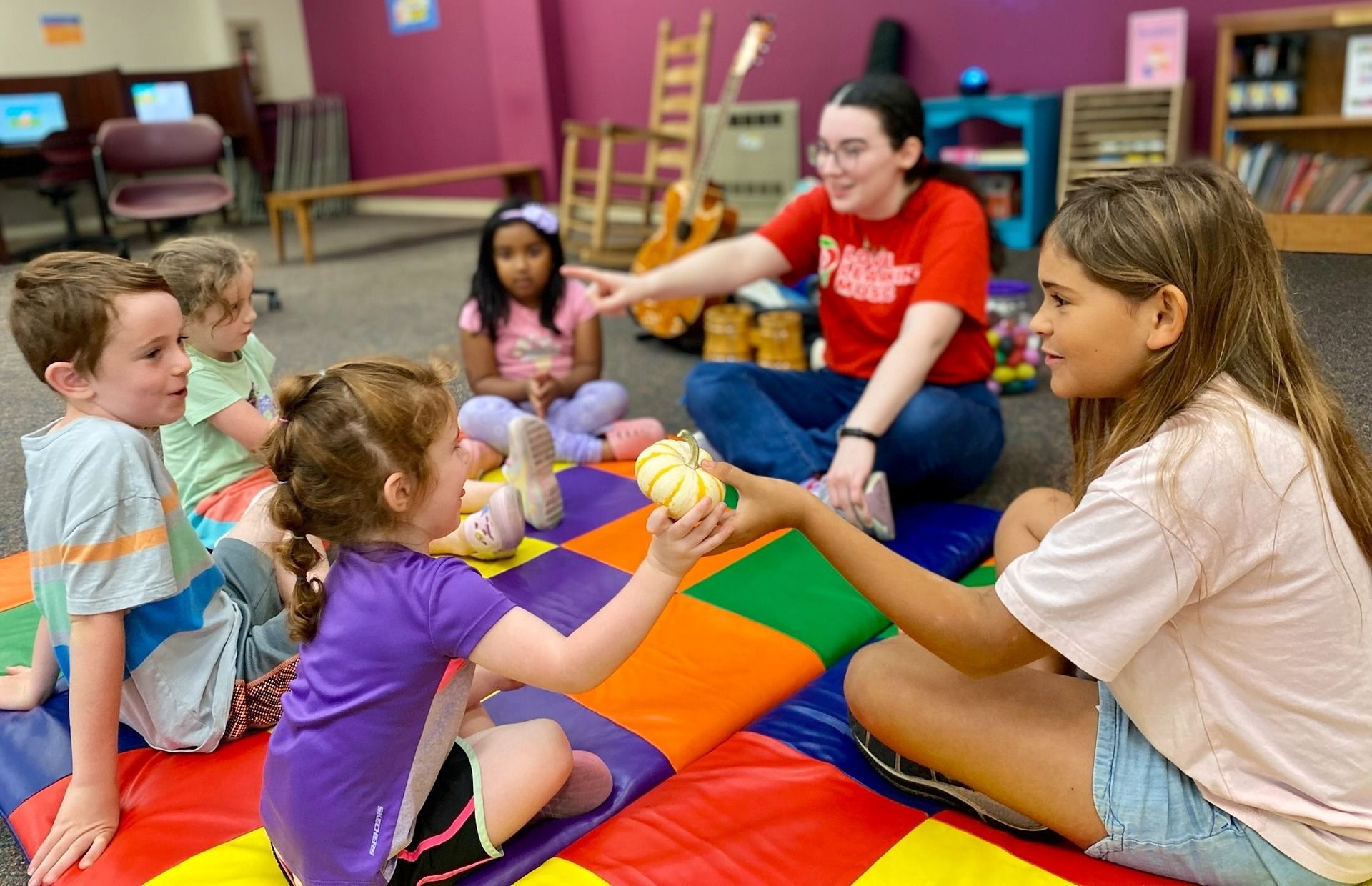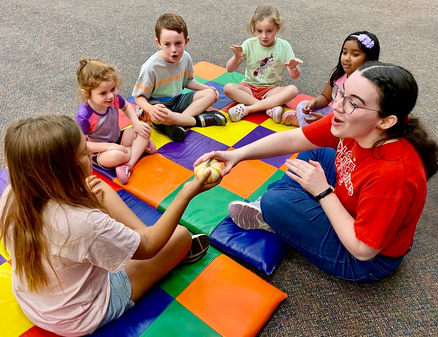 Our music therapist, Keely, led participants through interactive fingerplays, movement songs, instrumental play, and a musical storybook. Children enthusiastically played instruments, moved colorful scarves, and passed a pumpkin around the circle while learning pre-academic concepts like days of the week, months of the year, and counting. The session also included a musical storybook emphasizing coping strategies for shyness and anxiety, including deep breathing techniques.